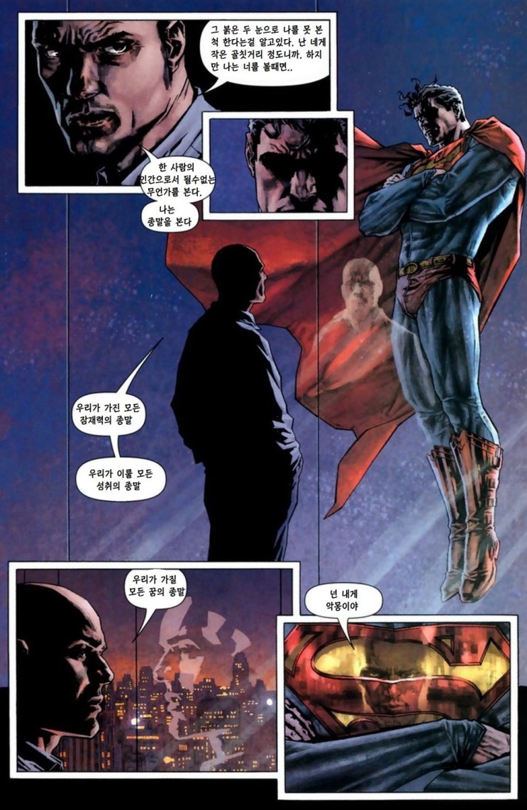 누군가에 의해 지켜지는 것은 그 '누군가의 변심'으로 파괴당할 수도 있을 것이라는 슈퍼맨의 모순적인 부분이 상당히 인상 깊었습니다. 그래서 이런 유형의 빌런이 있으면 공감이 가고 좋을 것 같은데 누가 안 써주나 싶습니다.